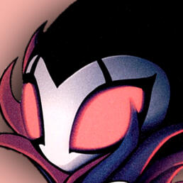 ❥ In his regular appearance, Grimm is a slender dark being covered by a multicolored cloak, with a gray exterior and a red interior. His face is pale with red eyes, and underneath his cloak, his body is scaled and purple.